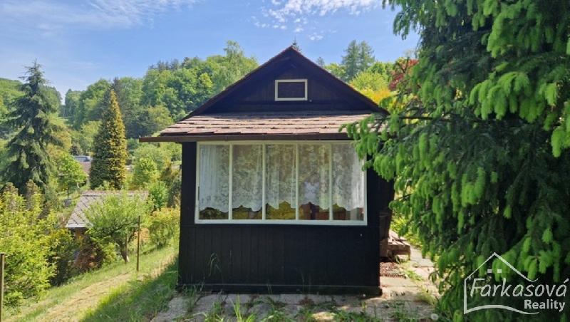 Dřevěná chata o výměře 17 m2 na svažitém pozemku o výměře 381 m2.