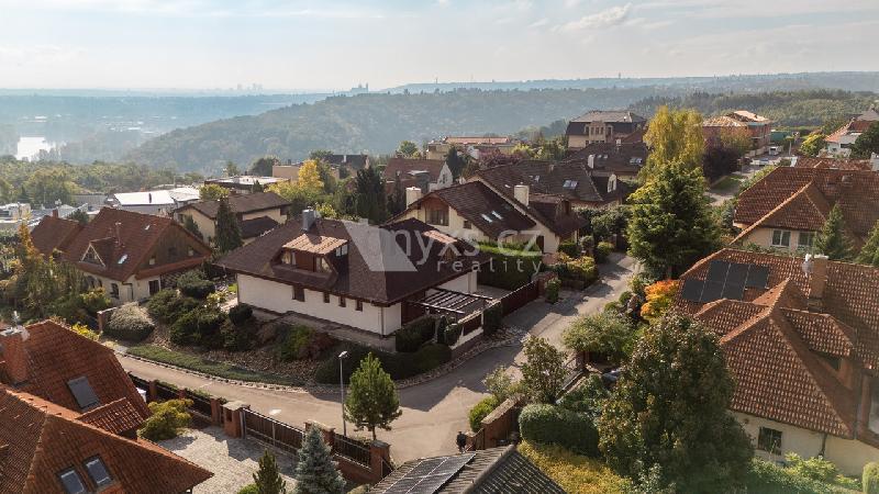 Součástí prodeje je také garáž pro 2 automobily a další parkovací stání na pozemku.Poklidná lokalita v sousedství romantického Tichého údolí a Roztockého háje je jednou z nejexkluzivnějších chráněných částí v okolí Prahy, přičemž dům je umístěn v prestižní části této vilové zástavby s krásným výhledem na panorama Prahy a Pražského hradu.Dům má dvě nadzemní podlaží a byl koncipován se záměrem pohodlného rodinného bydlení s dostatkem prostoru. Z předsíně s praktickými vestavěnými šatními skříněmi vstoupíte do hlavní obytné části domu. Prostorný a plně zařízený kuchyňský kout je propojen s jídelnou. Navazující obývací pokoj je rozlehlý, světlý a nabízí příjemné výhledy do zahrady. K dispozici v této části domuje také prádelna (může sloužit rovněž jako spíž či úklidová komora) a samostatná toaleta s umyvadlem.V patře se nachází 4 komfortní ložnice s vestavěnými skříněmi a 4 koupelny (3x vana, 1x sprchový kout). Ze všech ložnic se skýtají malebné výhledy na okolní vilovou zástavbu a do zeleně. Ložnice v zadní části domu okouzlí nádhernými výhledy na Prahu. Dům je vytápěn plynovým kotlem, který je umístěn v technické místnosti. Vybavení domu dále zahrnuje podlahové vytápění v přízemí domu, dřevěná euro okna s izolačními dvojskly, na podlahách dlažba, v 1 NP koberce, kompletní zateplení domu, na zahradě odpočinková terasa. Městská část Prahy 6 Lysolaje má kompletní občanskou vybavenost, je vzdálená několik minut autem z Dejvic a 15 minut na letiště. Na mezinárodní školu Riverside je to autem necelých 5 minut a na mezinárodní školu ISP v Nebušicích se dostanete za 15 minut, v okolí jemateřská i základní škola Járy Cimrmana. Lysolaje jsou obklopeny nádhernou přírodou a poskytují ideální zázemí pro rodinný aktivní život (plavecký bazén, tenisové kurty, stadion, cyklotrasy, turistické stezky).