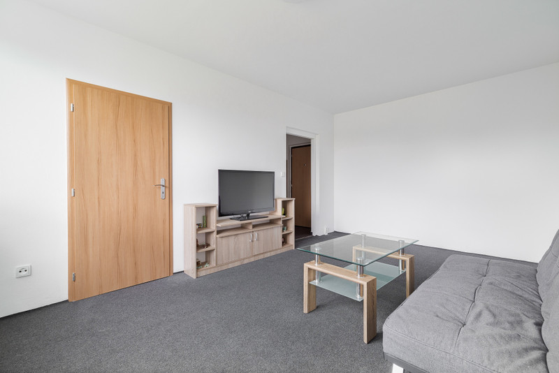 Díky umístění kuchyňské linky v chodbě získáváte plnohodnotný obývací pokoj a ložnici. Koupelna má sprchový kout a WC. Kuchyň je vybavená vším potřebným – nádobí, elektrický sporák s troubou i lednice s mrazákem. V ložnici je prostorná vestavěná skříň, kam se vejdou všechny vaše věci. V obýváku čeká televize se základním balíčkem programů. Pračka v koupelně a balkón v mezipatře vyřeší vaše praní.