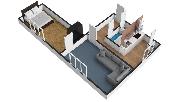 V obývacím pokoji je sedačka, ložnice je vybavena velkou postelí a šatními skříněmi. Obytné pokoje jsou průchozí a působí vzdušně. Orientace bytu je na východ a jih, díky čemuž je interiér světlý po celý den.