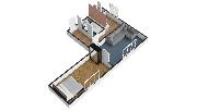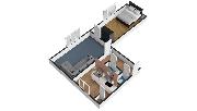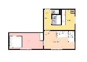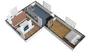 Jižně orientovaný obývací pokoj je bez nábytku, ložnice je vybavena velkou kvalitní postelí s matracemi a dále praktickými šatními skříněmi.